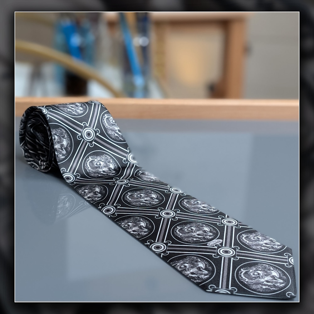This satin art tie is created from the same inking that underlies my horned owl portrait “Tufted Twilight.” It is clean, balanced, and confident, made for those who know what they want and move with quiet conviction.