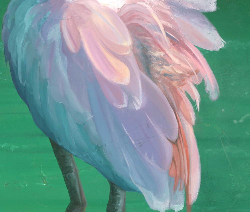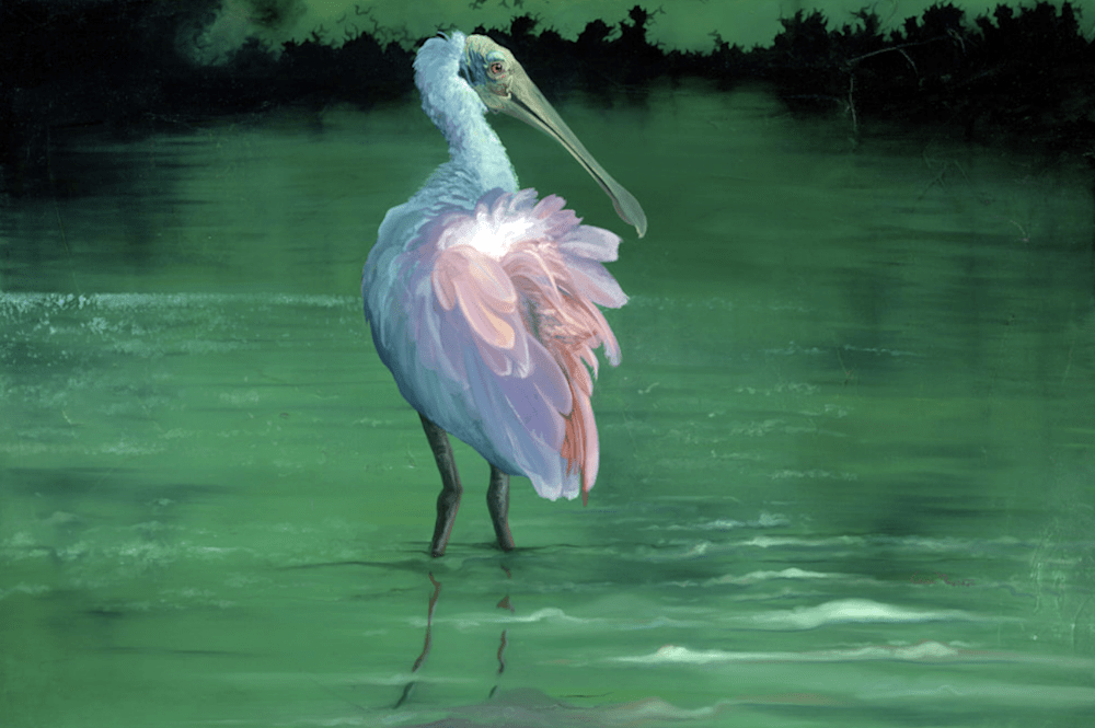Quiet contemplation surrounds the theme of this original oil painting. A pallet of pale cool color drape across this roseate spoonbill as it’s soft feathers blow with a quiet grace. The stillness created by the reflective waters and the peaceful bird brings the viewer into this scene to lose themselves in thought. It’s always those small moments we catch in time where we can sit and relax to reflect. As you bring this piece into your room you can almost feel the beauty and calm wash over your thoughts. The main hues of this artwork are pale pink, blue and green.