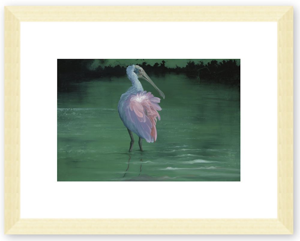 The scene is set against reflective waters, where the spoonbill stands in quiet repose. This mirrored stillness draws you into the artwork, encouraging moments of introspection and quiet reflection. It's a reminder that life's small, contemplative moments are worth cherishing.