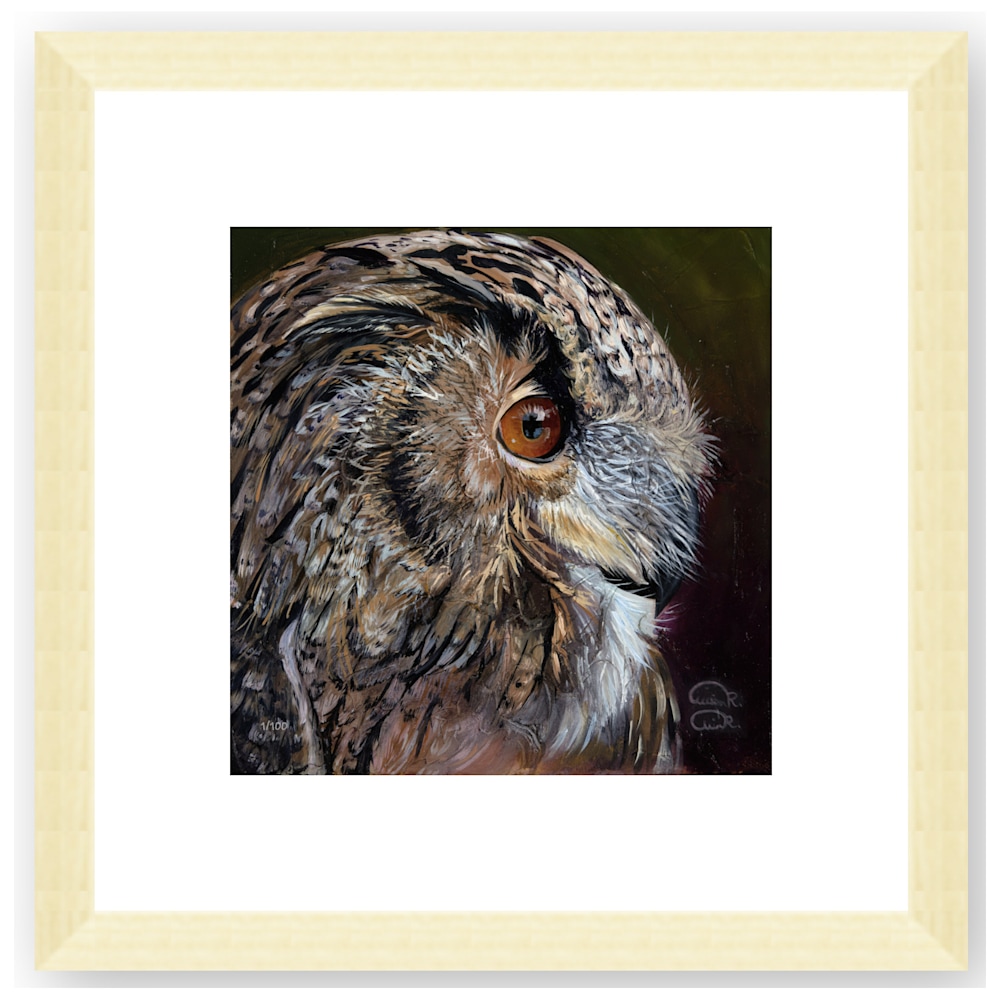 Experience the awe-inspiring beauty of wildlife through Allison Richter's fine art print, available for sale. This captivating artwork features a striking eagle owl portrait that transcends traditional art with its meticulous detail and captivating technique.
