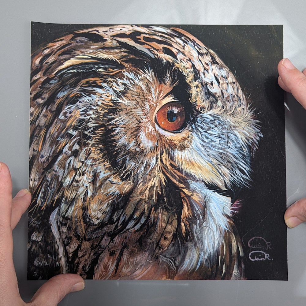 The print showcases the owl with striking realism, beautifully captured in profile. Its piercing gaze and intricately patterned feathers come to life with a masterful use of color and shading, making the owl's presence truly captivating.