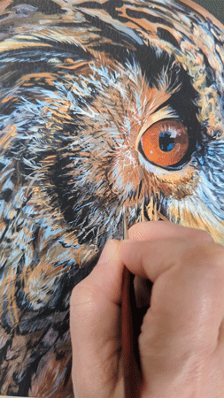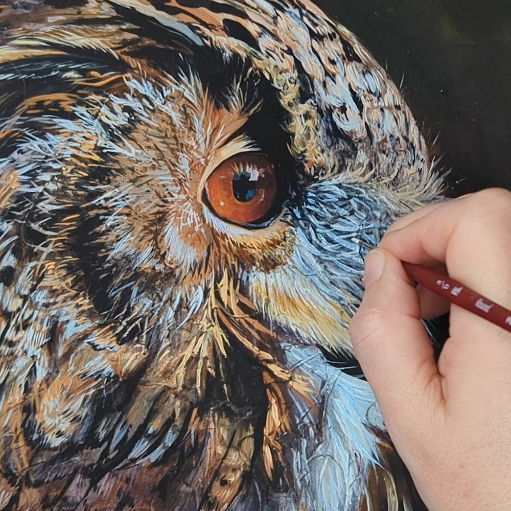 When I was painting this piece, I kept coming back to the eyes. There’s something about an owl’s gaze that isn’t just sharp, it’s knowing. I wanted to capture that feeling of being seen, the way an owl locks onto something with complete focus, as if it already understands more than you do.