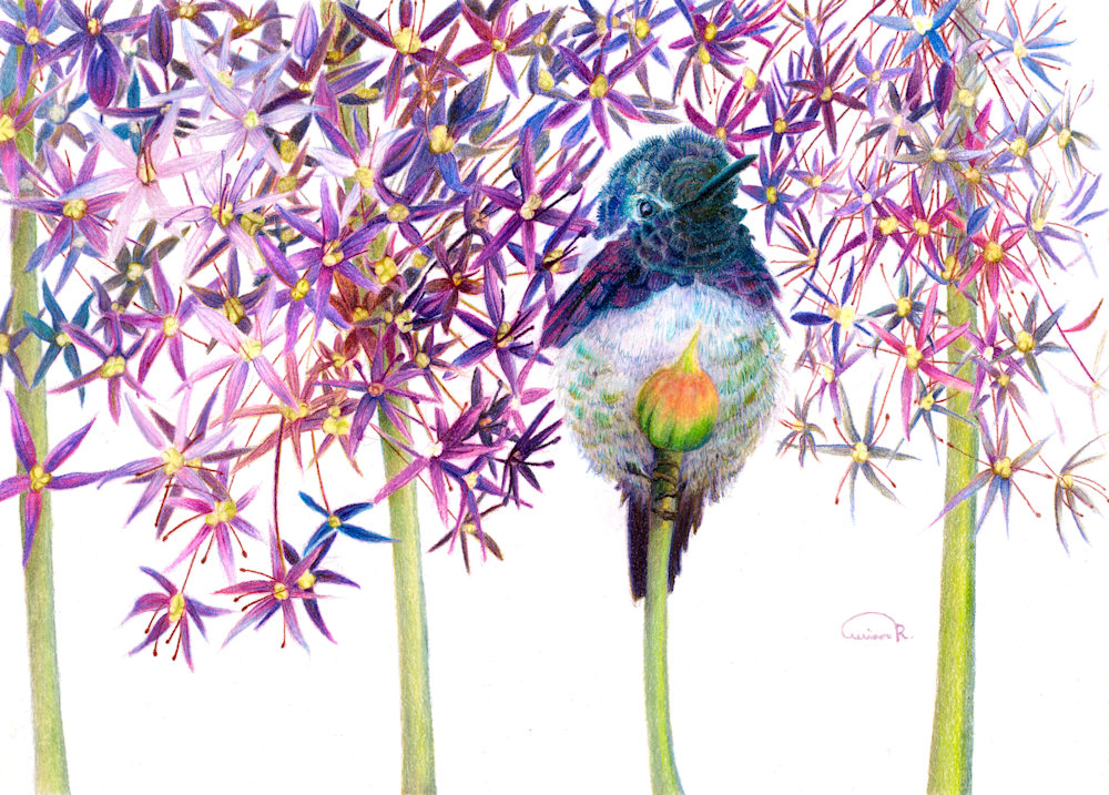 Step into the vibrant world of hummingbird artist Allison Richter with her mesmerizing original color pencil artwork, "Petal Pusher." In this exquisite piece, the grace and allure of a Costa's Hummingbird come to life amidst a backdrop of amaranth flowers. But what makes this artwork truly exceptional is the artistic concept that inspired it: the enchanting interplay of shape repetition.