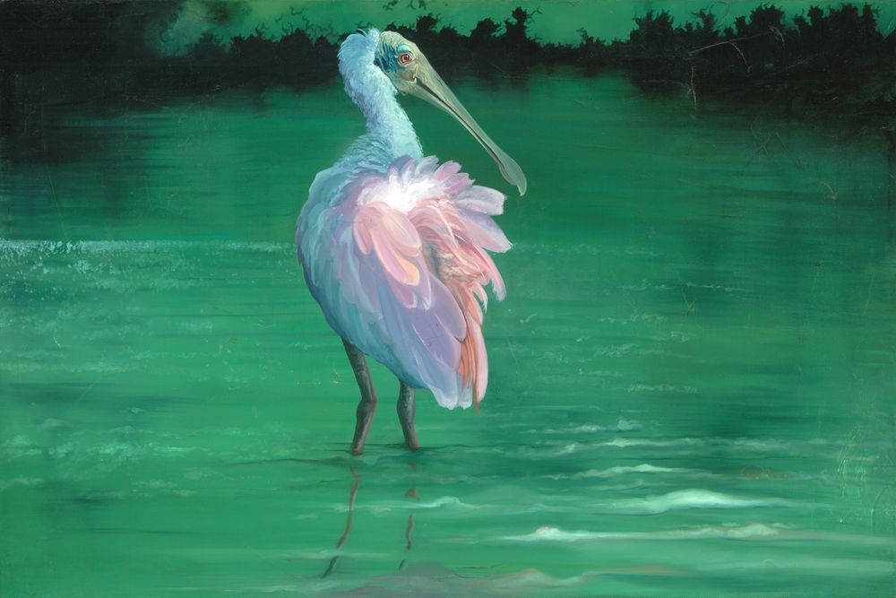 The scene is set against reflective waters, where the spoonbill stands in quiet repose. This mirrored stillness draws you into the artwork, encouraging moments of introspection and quiet reflection. It's a reminder that life's small, contemplative moments are worth cherishing.