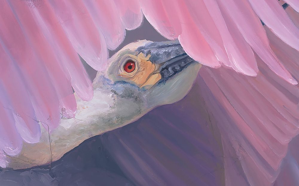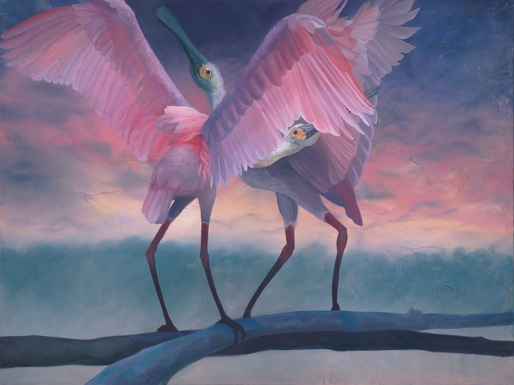 "Private Chatter" is not just a painting; it's a glimpse into the secret world of nature, where conversations are held in hues of purple, blue, pink, and red violet. This original oil on canvas by Allison Richter unveils a moment of avian intimacy—a whispered conversation between two roseate spoonbills, hidden from the bustling world around them.