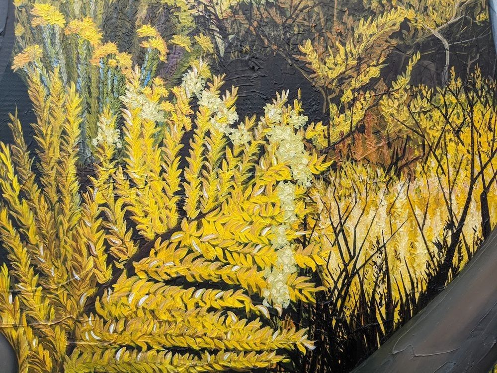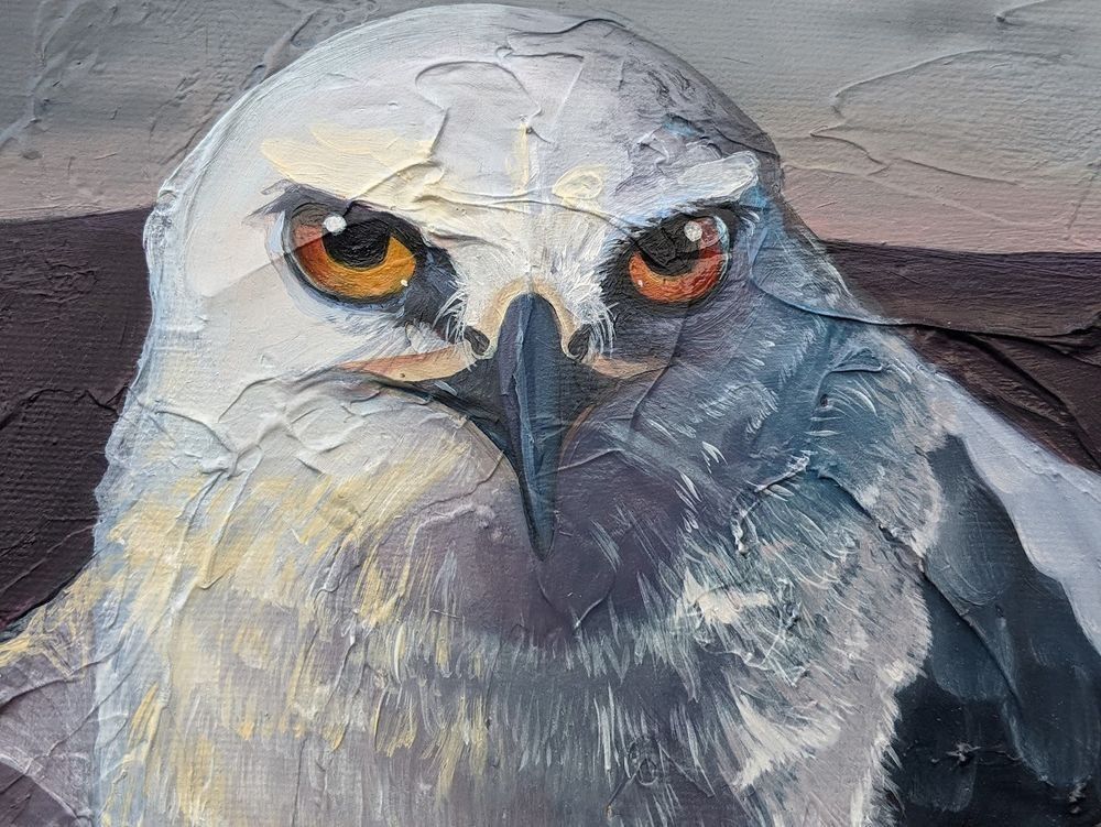 Behind the kite, the storm builds over distant mountains. I was drawn to the contrast, how storms often trail light, and how skies can be golden in one place and deep violet in another. It became a personal challenge to explore this push and pull of atmosphere using yellow and purple throughout the piece, allowing the sky to shape the mood as much as the bird. The composition was built with purpose, and finished with signature impasto brushwork to create texture, weight, and presence. You can see it in the storm clouds, in the subtle shifts across her wings, and in the feeling of wind moving just behind.