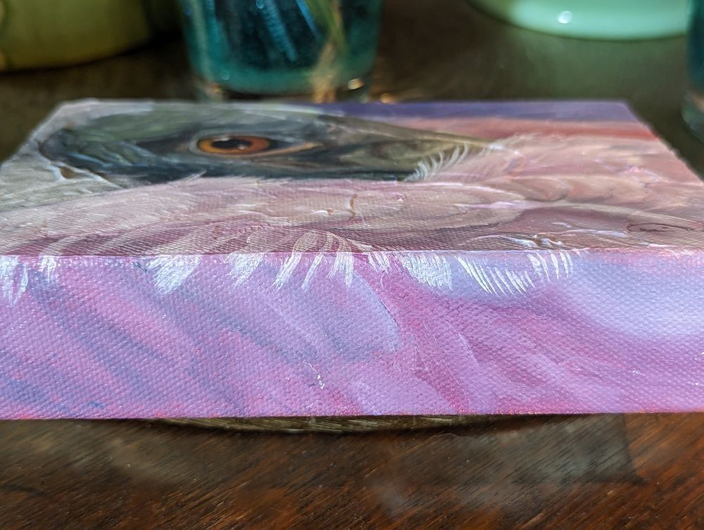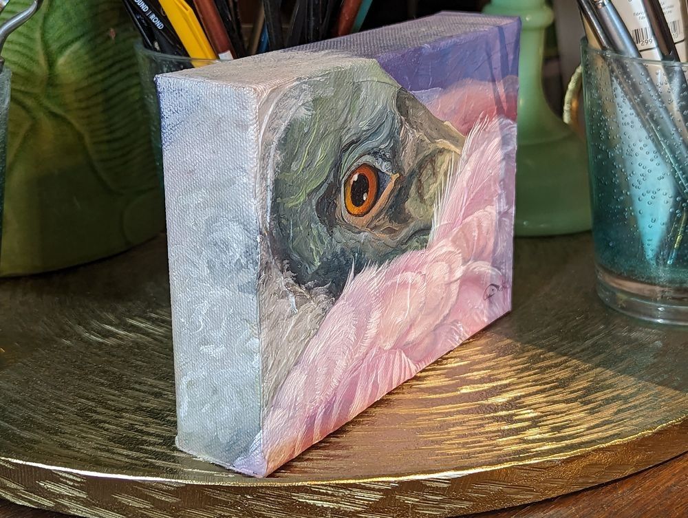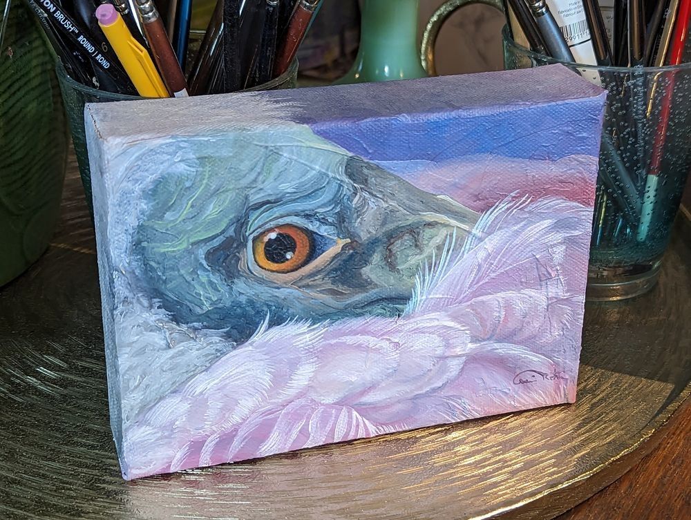 We all have our moments when we want to people watch. Who among us hasn't gone shopping, to a park, to the airport, or out for the day and found ourselves looking around to observe everything around us. We're just waiting to talk to our friends or family about what and who we saw. This is the feeling I wanted to capture with this oil on canvas rosette spoonbill Wingman. I wanted to bird to be observing without being seen to look around so that it could take in the world around it.